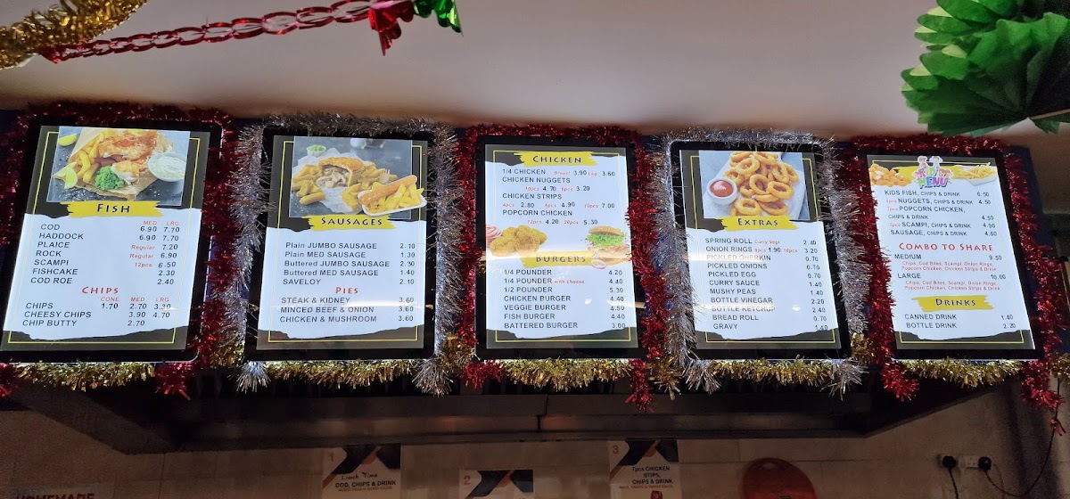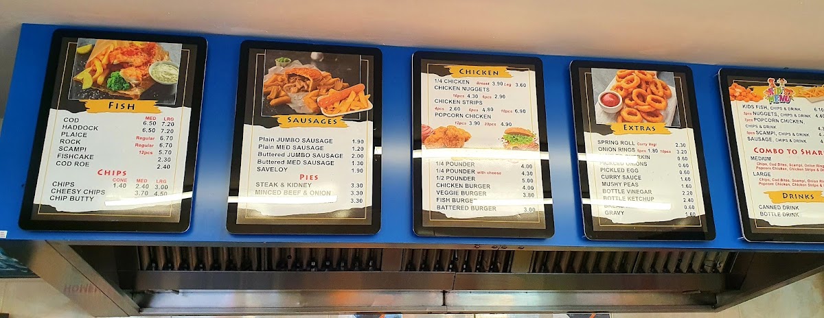 The Codfather in Bury Saint Edmunds offers a diverse and hearty menu, making it a great choice for anyone craving traditional fish and chips or comfort food. Their fish selection includes classic options like Cod, Haddock, PlaiceRock, and Scampi. For those who prefer sausages, the menu features a variety, including Plain Jumbo Sausage (£?), Buttered Med Sausage (£?), and the uniquely flavored Saveloy (£?). There are also savory pies like Steak & Kidney and Minced Beef & Onion. For chicken lovers, the menu boasts a range of choices such as 1/4 Chicken, Chicken Nuggets, and Popcorn Chicken (£?), while burger fans can enjoy options like the 1/4 Pounder, Chicken Burger, or even a Veggie Burger (£?). Extras include crispy Spring Rolls, Onion Rings, and tangy Pickled Gherkins. If you're craving chips, they offer Chips, Cheesy Chips, or the indulgent Chip Butty. The kids' menu includes delicious options like Kids Fish, Chips & Drink (£?) and Sausage, Chips & Drink (£?). With a variety of drinks, including Canned Drinks and Bottle Drinks, it's clear that The Codfather is a place that caters to all tastes and appetites.